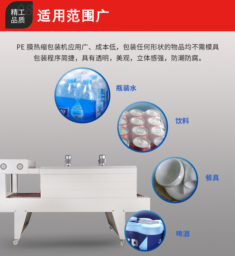 - 適用于中型規(guī)模的包裝生產(chǎn)線。其優(yōu)勢(shì)在于加熱均勻、穩(wěn)定,使用壽命長(zhǎng)。在一些中型的食品、日用品生產(chǎn)企業(yè)中,不銹鋼加熱系統(tǒng)的 PE 熱收縮機(jī)能夠提供高質(zhì)量的包裝效果,滿足一定批量產(chǎn)品的包裝需求。