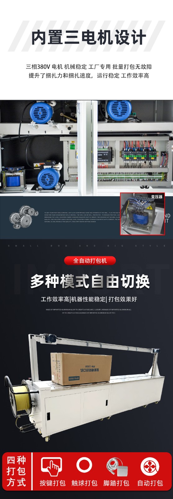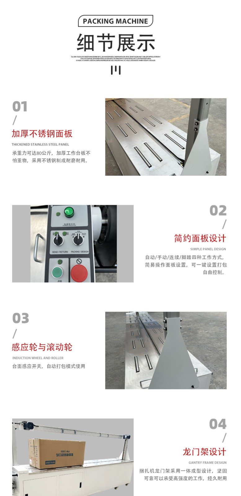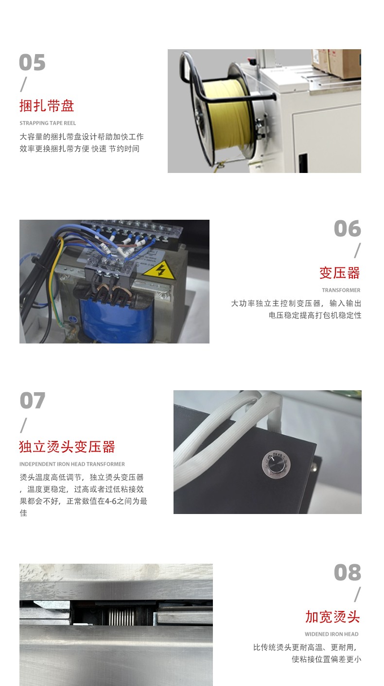 1. 智能化控制系統:配備先進的微電腦控制系統,可精準設定打包參數,如打包帶長度、加熱溫度、壓緊時間等,操作界面直觀易懂,操作人員能輕松根據不同物品的打包需求進行靈活調整。