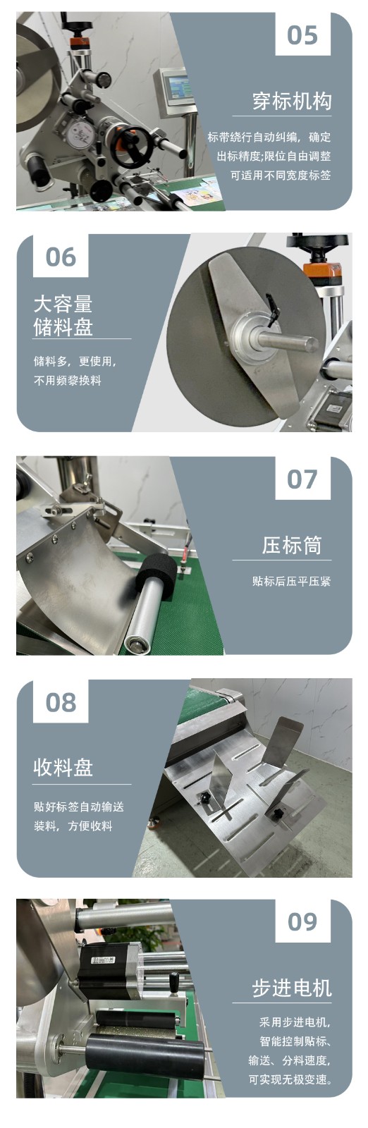 貼標精度高:采用細分步進電機或伺服電機驅動送標,搭配標帶繞行糾偏機構和偏心輪牽引機構,確保出標精準,貼標精度可達 ±1mm。