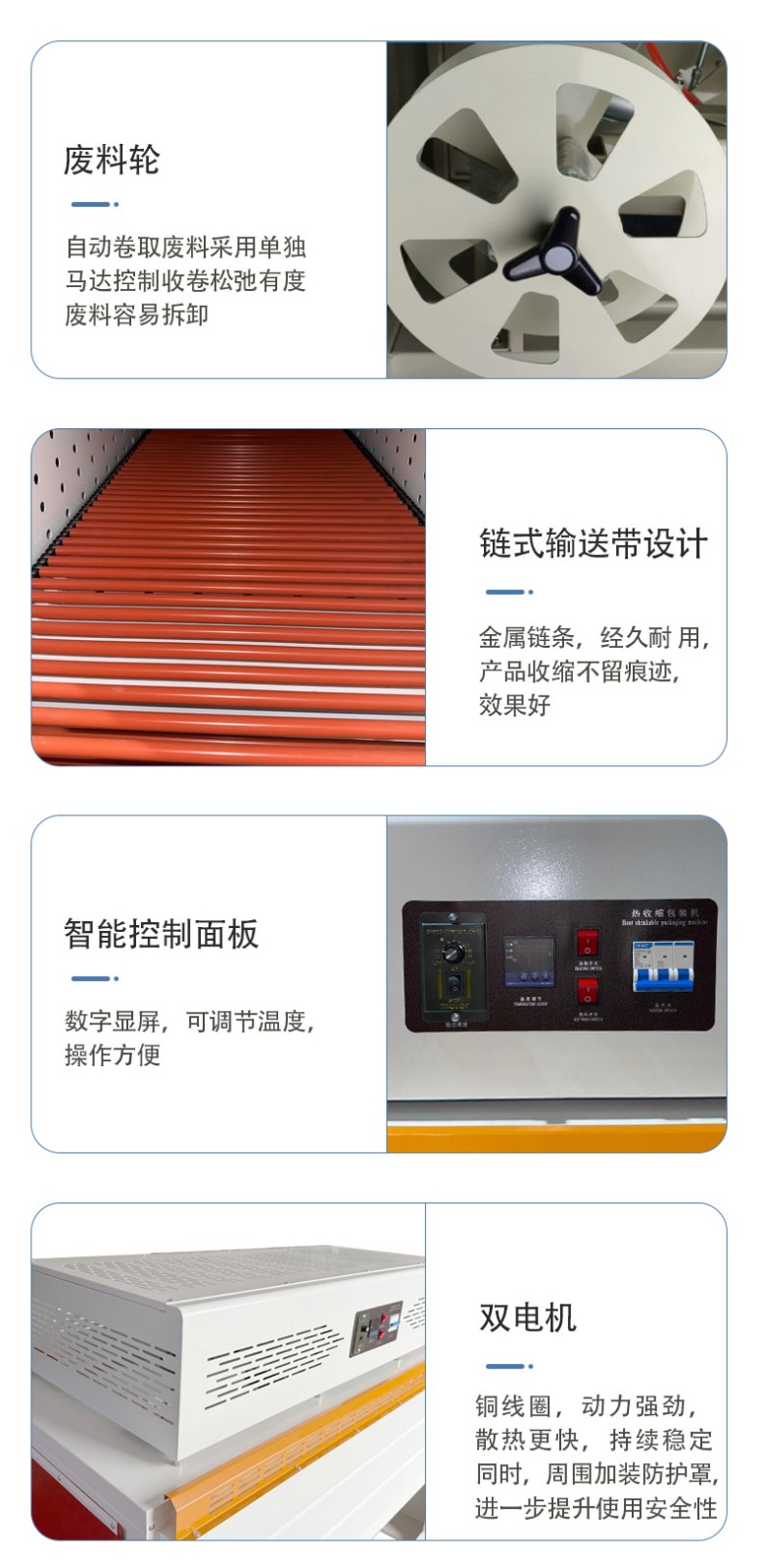 - 兼容多種包裝薄膜:其恒溫加熱封切系統(tǒng)可適配 PE、PVC、POF 等多種常用熱收縮膜。而且封刀多采用美國杜邦特弗龍防粘涂層,能應(yīng)對(duì)不同薄膜的封切溫度需求,避免薄膜粘連刀具,保證封口牢固不焦化,像 POF 這種對(duì)封切精度要求高的環(huán)保薄膜,也能實(shí)現(xiàn)理想封切效果。