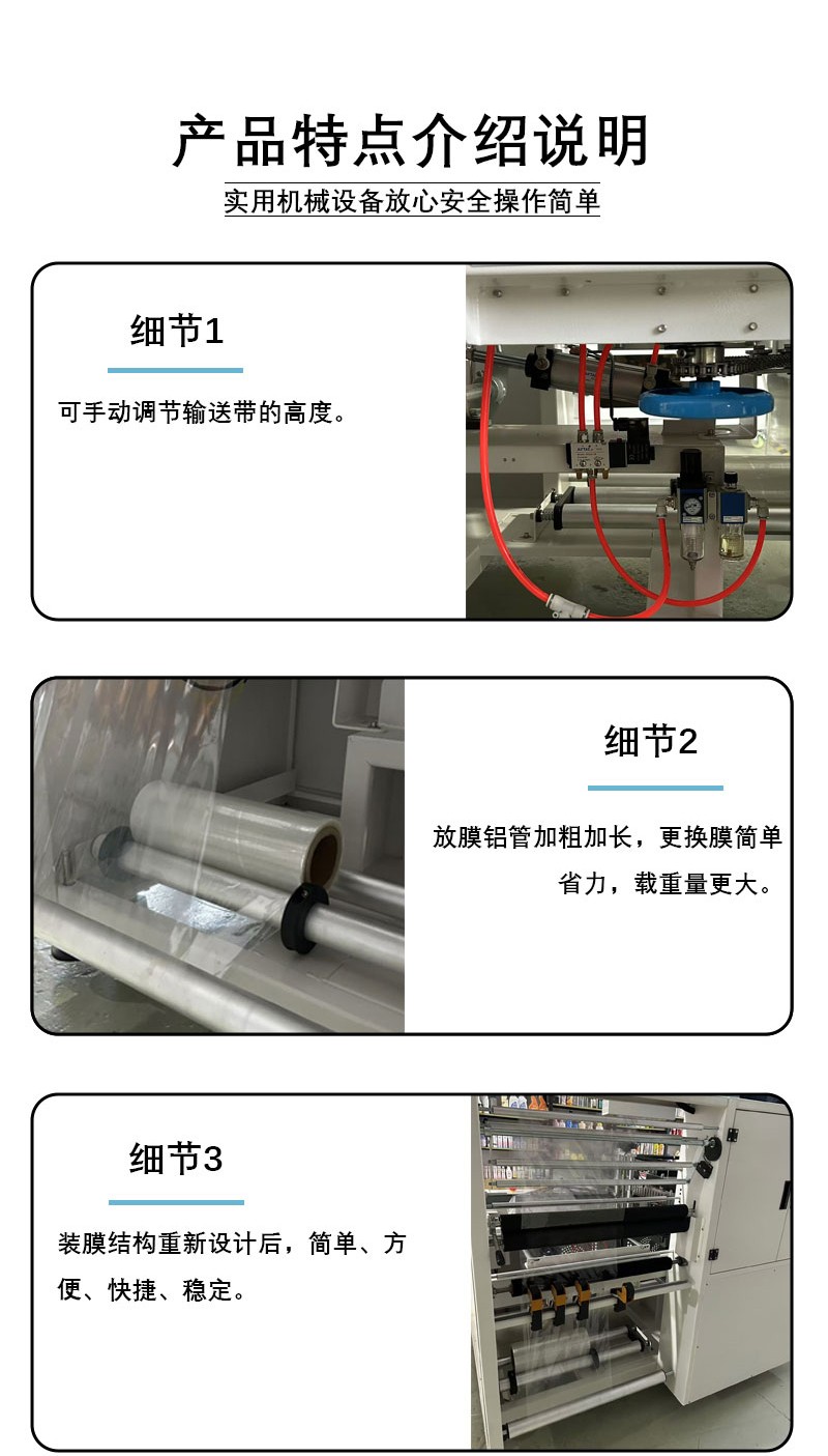 - 安全穩定,運維便捷配備急停按鈕、封刀防燙傷保護罩、超溫報警等多重安全裝置,保障操作人員人身安全;設備關鍵部件采用標準化設計,結構簡單易拆解,日常清潔、換膜、維護無需專業技術人員,大幅降低設備運維成本與停機時間。