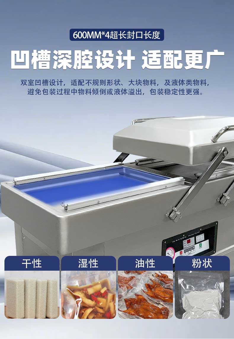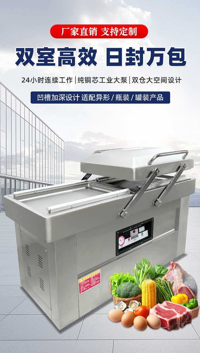 雙室真空包裝機(jī)可在真空包裝的基礎(chǔ)上,向包裝袋內(nèi)充入氮?dú)狻⒍趸嫉榷栊詺怏w或混合氣體,起到更好的防腐、防潮、防氧化等保質(zhì)效果