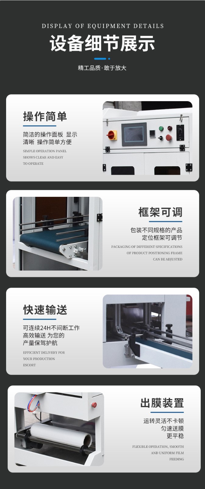 • 適用范圍廣:可以適應多種產品的套膜需求。對于不同尺寸、形狀和重量的產品,只要在設備的規格范圍內,都可以進行套膜。同時,它也能夠使用多種類型的包裝薄膜,如 PE、PVC 等常見薄膜,企業可以根據產品的特性和成本等因素靈活選擇薄膜材料。