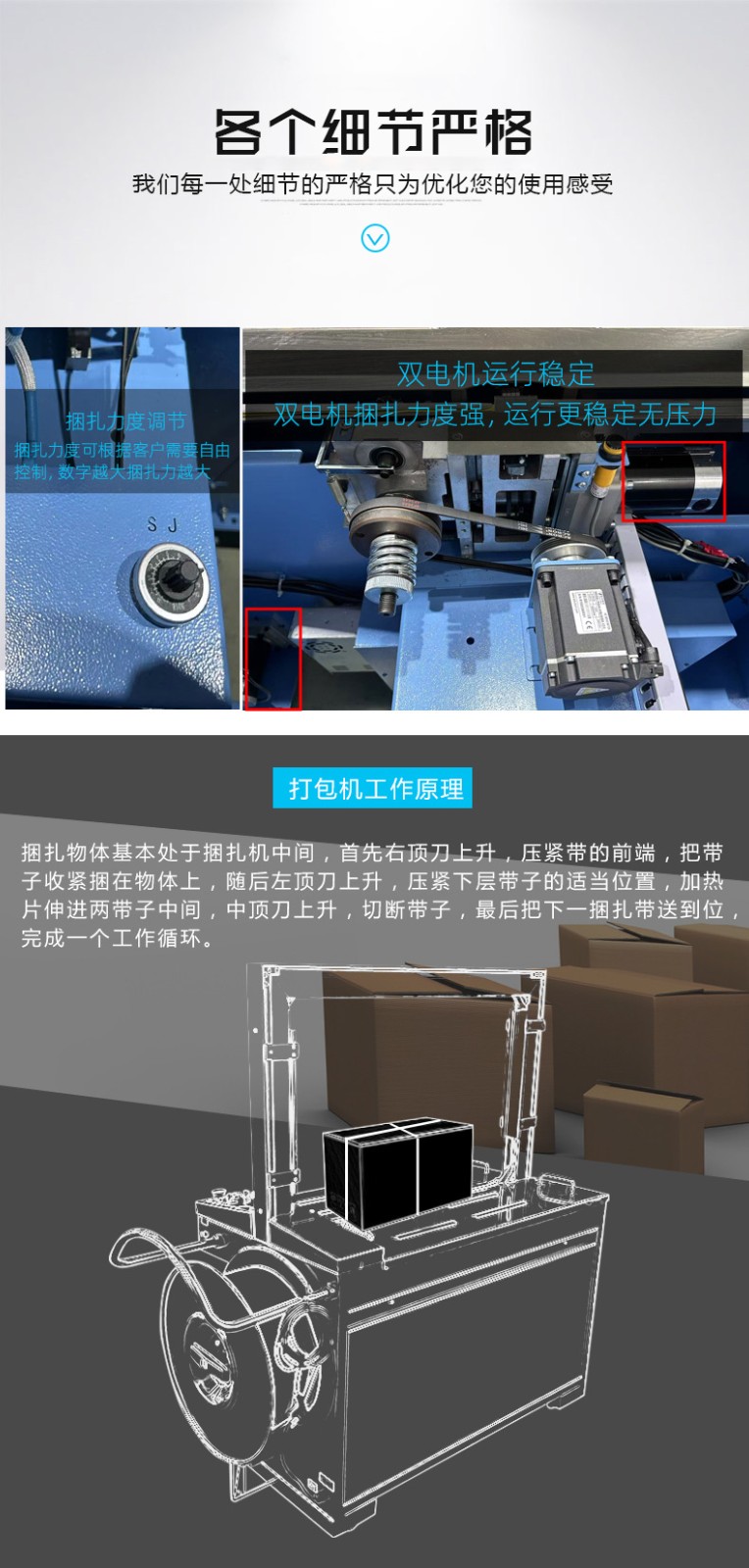 • 自動上帶:機器啟動后,會自動從打包帶卷中抽出打包帶,并將其傳送到預定的位置,準備進行打包。這個過程無需人工干預,大大提高了工作效率。