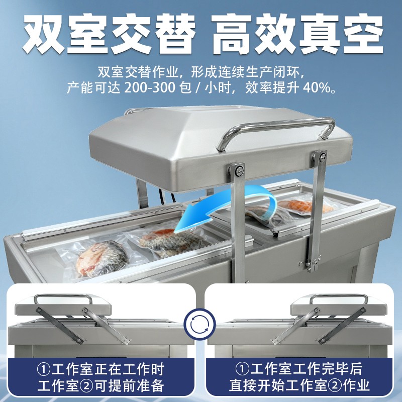 雙室凹槽真空包裝機,專為鹵味、水產(chǎn)、預制菜等帶湯汁、高水分產(chǎn)品量身打造,創(chuàng)新下凹式真空室結(jié)構(gòu)搭配雙室交替工作模式,既解決液體包裝溢漏難題,又大幅提升生產(chǎn)效率,是食品加工、生鮮鎖鮮的得力設備。