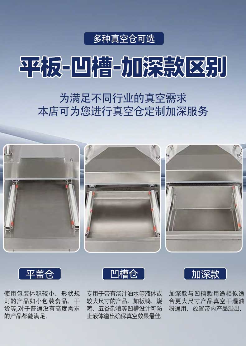 下凹式真空室深度支持定制,產(chǎn)品放置后呈傾斜狀態(tài),抽真空時湯汁牢牢鎖在凹槽內(nèi),不會流向封口處;傾斜適配的加熱條與硅膠條緊密貼合,封口平整牢固,杜絕漏封滲漏問題。雙室獨立運行設計,一個腔室抽真空封口的同時,另一個腔室可同步擺放待包裝產(chǎn)品,無縫銜接無空窗期,包裝效率較單室機型提升 50% 以上。